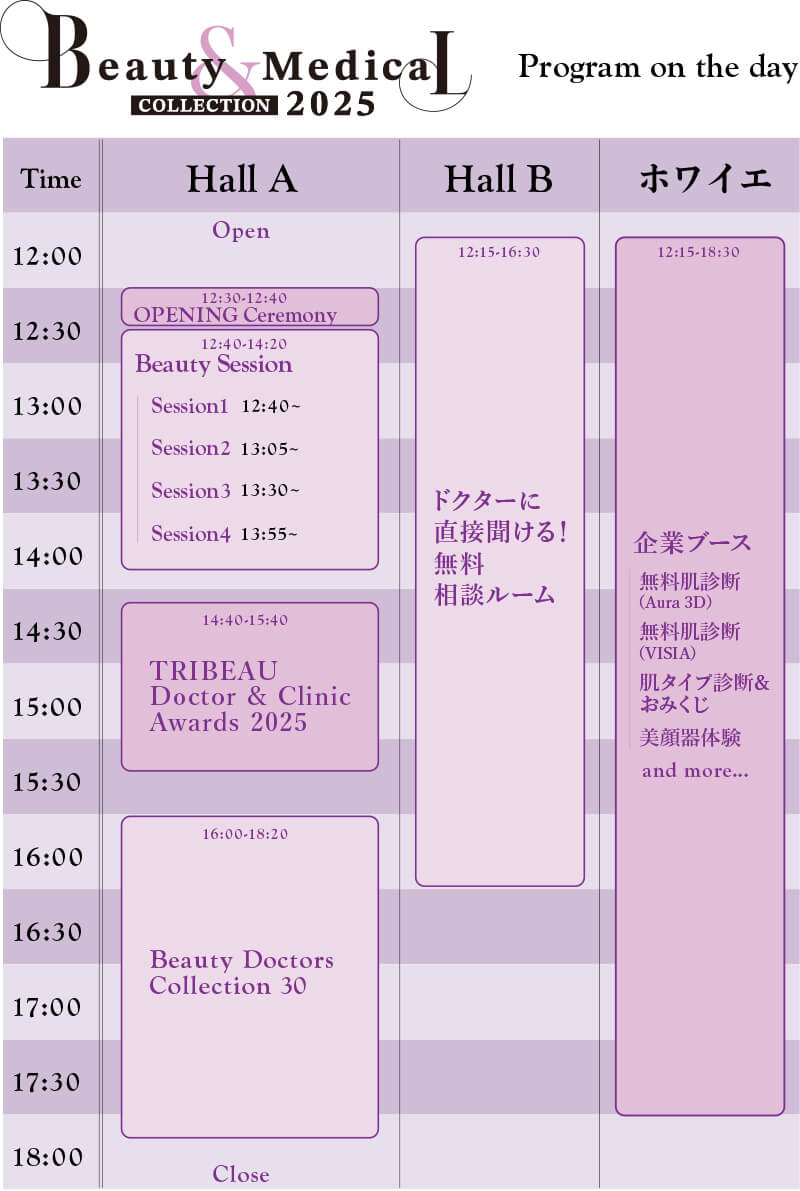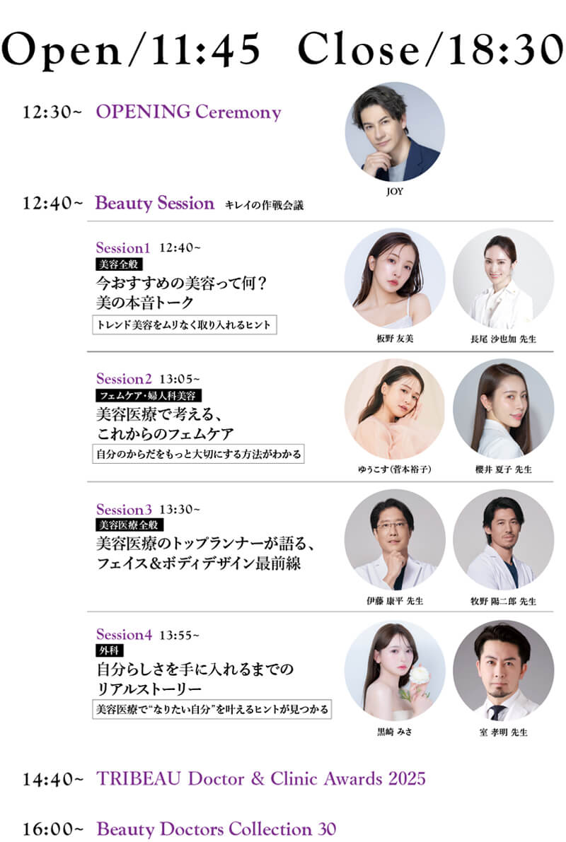 チケットを申し込む CONCEPT ~私だけの美学~ 美容医療の「知りたい」「試したい」を叶える、特別な1日。「Beauty Session 」「Beauty Doctors Collection 30」「ドクターに直接無料相談ルーム」など、あなたにぴったりな美容がきっと見つかる。 TIME TABLE GUEST JOY ファッションモデル・タレント 板野 友美 起業家・タレント ゆうこす (菅本 裕子) モテクリエイター・実業家 黒崎 みさ モデル・インフルエンサー 長尾 沙也加 THE ROPPONGI CLINIC院長 櫻井 夏子 サイトリ杉山美容クリニック院長 牧野 陽二郎 聖心美容クリニック 銀座院院長 日本形成外科学会 認定専門医・認定指導医 日本美容外科学会 認定専門医 伊藤 康平 聖心美容クリニック 六本木院院長 日本美容外科学会 認定専門医 室 孝明 ビスポーククリニック理事長 PROGRAM 「Beauty Session 〜キレイの作戦会議〜」 ホールA 12:40~14:20 12:40〜13:05 美容全般 今おすすめの美容って何?美の本音トーク 〜最新ビューティーTIPS〜 起業家・タレント板野友美さんと𝑻𝑯𝑬 𝑹𝑶𝑷𝑷𝑶𝑵𝑮𝑰 𝑪𝑳𝑰𝑵𝑰𝑪・長尾沙也加医師が、美容の“今”と“これから”を語る特別セッション。「最近注目している美容トレンドは?」「日々のケアで大切にしていることは?」など、実際の体験談や専門的な視点を交えながら、ライフスタイルに取り入れやすい美容のヒントをお届けします。 ※ 内容は変更になる場合がございます。 板野 友美 長尾 沙也加 先生 13:05〜13:30 フェムケア・婦人科美容 美容医療で考える、これからのフェムケア 〜女性のための美と健康の秘密、ゆうこす(菅本裕子)さんが櫻井医師に全部聞いちゃいました!~ ゆうこす(菅本裕子)さんが、リアルな悩みや実体験をぶっちゃけ質問。バストケアやVIO脱毛、妊娠・出産後のケアなど、なかなか人には聞きにくいテーマを、サイトリ杉山美容クリニック院長の櫻井夏子先生がやさしく解説する、共感と安心のセッション。視聴者からの質問にも答える参加型コーナーも予定しています。 ※ 内容は変更になる場合がございます。 ゆうこす (菅本 裕子) 櫻井 夏子 先生 13:30-13:55 美容医療全般 美容医療のトップランナーが語る、フェイス&ボディデザイン最前線 〜専門医集団の総合力で叶える、完成度の高い美しさ〜 第一線で活躍し、美容医療に携わる医師を指導する立場で、日本を代表する「聖心美容クリニック」の専門医2名が登壇。顔全体のバランスを整えるデザインから、鼻や目などのパーツ特化の施術、さらにボディラインの形成まで、専門力からなる総合力で、完成度の高い美の秘密を、実例を交えながらお伝えします。 ※ 内容は変更になる場合がございます。 牧野 陽二郎 先生 伊藤 康平 先生 13:55〜14:20 美容外科 自分らしさを手に入れるまでのリアルストーリー 〜黒崎みささん×ビスポーク室医師が語る美容外科のリアル〜 美容整形を決意した理由やダウンタイムの乗り越え方について、黒崎みささんが自身のリアルな体験を語ります。ビスポーククリニックの福岡院院長である室医師とともに当時を振り返りながら、「整形を考える理由」や「初心者におすすめの施術」など、美容医療との向き合い方をご紹介します。 ※ 内容は変更になる場合がございます。 黒崎 みさ 室 孝明 先生 TRIBEAU Doctor & Clinic Awards 2025 ホールA 14:40~15:40 国内最大級の美容医療口コミ・予約アプリ『トリビュー』が贈る「TRIBEAU Doctor & Clinic Awards 2025」過去4年間に寄せられた本人確認済みの口コミをもとに、施術ごとの投稿数・評価点・ドクター情報の保存数などのデータを集計。美容医療の現場で信頼と実績を築いてきた医師およびクリニックを表彰します。リアルな体験談に裏づけられた「信頼」と「実績」に光が当たる瞬間。「ありたい自分でいられる世界を実現する」というトリビューの想いを込め、美容医療の魅力とその最前線で活躍するプロフェッショナルたちの姿をお届けします。 AWARD部門 Beauty Doctors Collection 30 ホールA 16:00~18:20 業界初の「Beauty Doctors Collection 30」では、美容医療の最前線で活躍するトップドクター30名が渋谷ヒカリエに集結。ドクター自らがランウェイを歩き、約3分間のプレゼンテーションでクリニックの魅力を披露します。来場者は、それぞれの個性や強みを比較しながら、自分に最も合うドクターを見つけることができます。さらに、ドリンク片手にリラックスした雰囲気で交流できるクロスパーティーも開催。気になるドクターの人柄に直接触れ、比較しながら自分に合ったドクターを見極めることで、より安心して選ぶことができ、その場でカウンセリング予約も可能です。 ドクター一覧 「ドクターに直接聞ける!無料相談ルーム」 ホールB 12:15~16:00 ホールBでは、美容医療に関心を持ちながらも「どの施術が自分に合っているのか分からない」「クリニックに行くのは少しハードルが高い」といった声に応えるべく、複数のトップドクターによる無料相談イベント「ドクターに直接聞ける!無料相談ルーム」をイベントの全時間帯